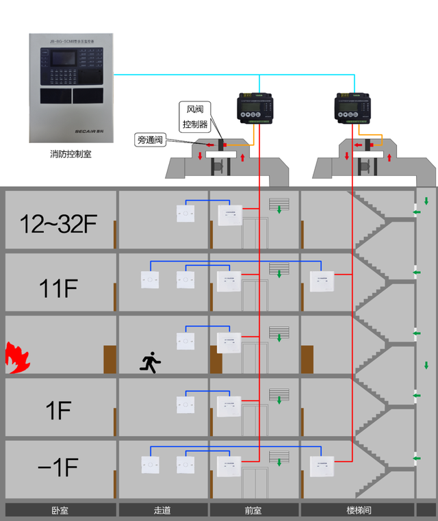 SC560智能余壓監(jiān)控系統(tǒng)由SC560-T02余壓探測器、SC560-K01余壓控制器、SC560-Z01風閥執(zhí)行器、系統(tǒng)監(jiān)控專用軟件等部分或全部沒備組成,完全滿足并高于GB51251《建筑防煙排煙系統(tǒng)技術標準》、GB50016建筑設計防火規(guī)范》和GB50098《人民防空工程設計防火規(guī)范》等相關國家標準中的功能需求。